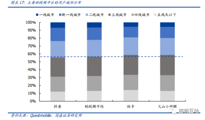 相比于抖音、西瓜视频等短视频平台,火山小视频的用户分布更加下沉。根据Questmobile在2019年6月的数据,短视频平台的三线城市及以下用户平均占比为56.7%。相比之下,抖音的下沉市场用户占比为55.9%;而火山小视频占59%,与快手相当。