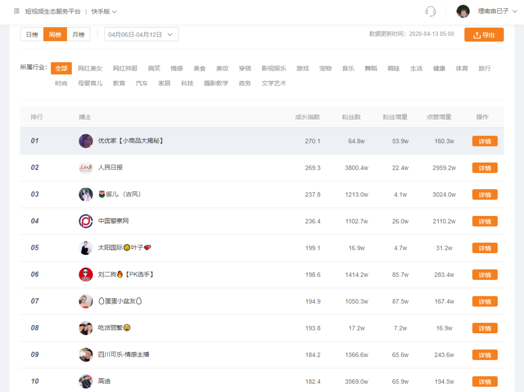 飞瓜快手涨粉榜就是高效率的找成功案例神器!涨粉榜会统计每天、每周、每月快手平台涨粉情况,并形成排行榜。我们可以在排行榜里快速找到各行业涨粉最快的快手号数据。