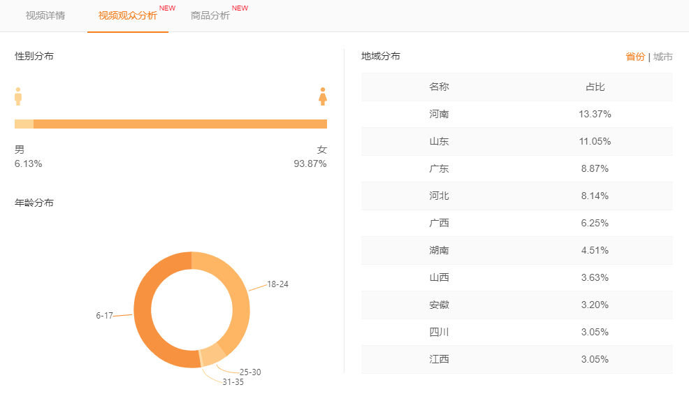 再来看看视频的观众粉丝。优优家的粉丝画像是所有商家都羡慕的数据,女性粉丝比例高达93%,18-24岁年龄段达到近四成,购买潜力极佳。