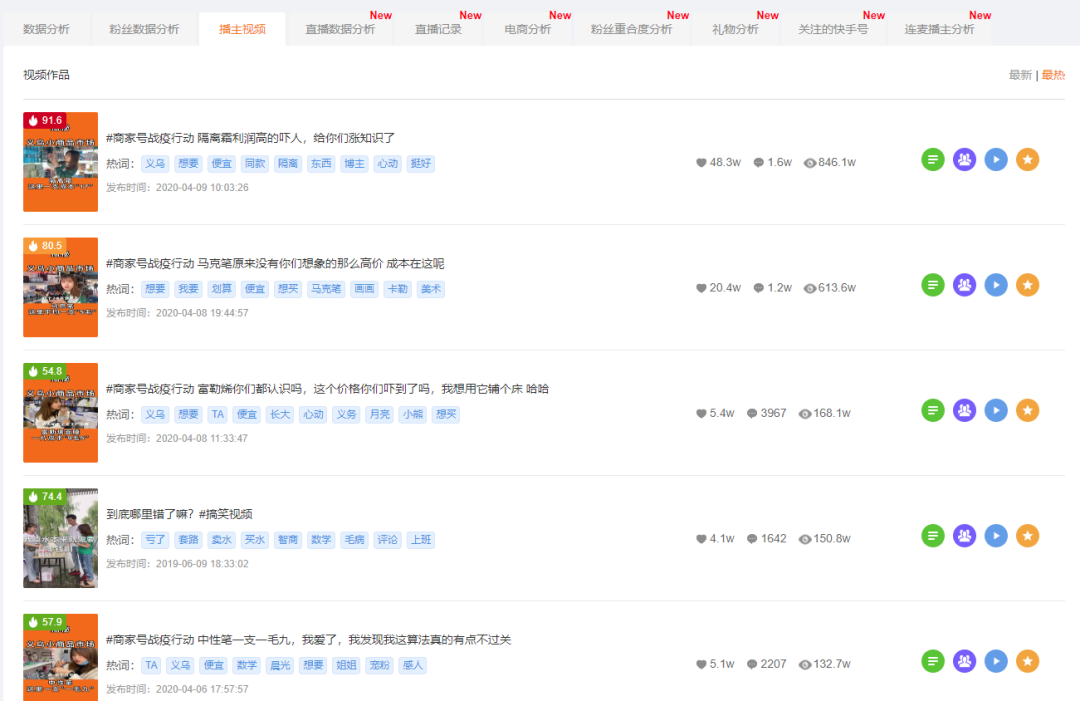 飞瓜快手播主视频会详细记录快手主播的视频数据,按照最热视频进行排序后,我们发现了优优家暴涨粉丝的答案。