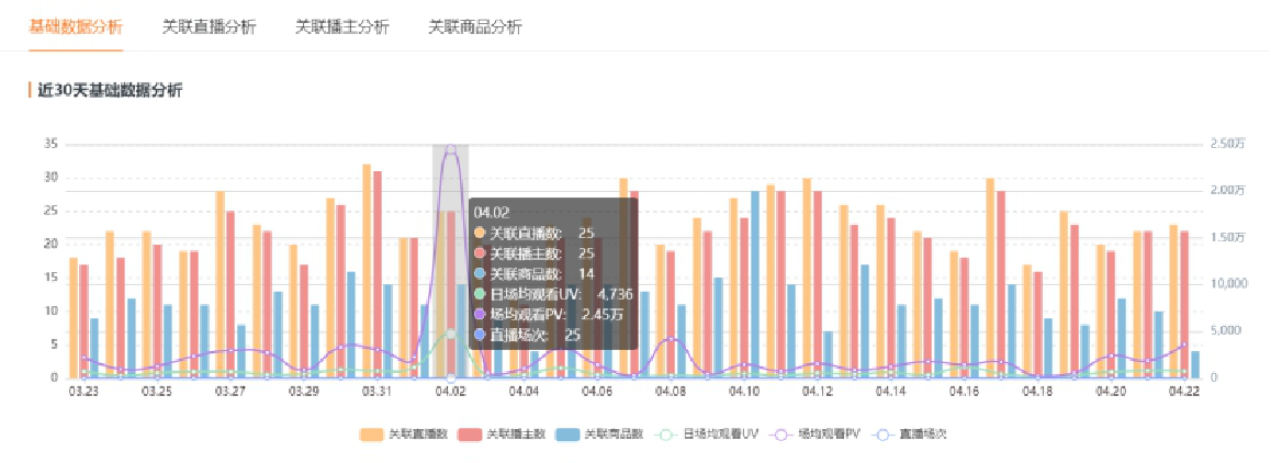 根据知瓜数据后台显示,近30天以来,Wonderlab的淘宝直播一直处于高场次高频率的节奏,4月2日进入薇娅直播间,场均观看PV也达到了最高点。