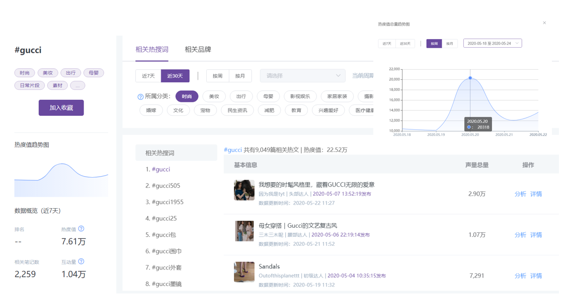 以小红书为例,作为一个专业种草平台,小红书向来是品牌们的兵家必争之地。千瓜数据显示,近30天,Gucci共有9千多篇相关热文,其中“520个古驰故事”在小红书持续发酵,520当天的相关热度超过2万,达到近期峰值。相比而言,同样在520期间主推经典包袋的LV,即使粉丝数比Gucci多,近30天相关热文2千多篇,就显得有些单薄了。