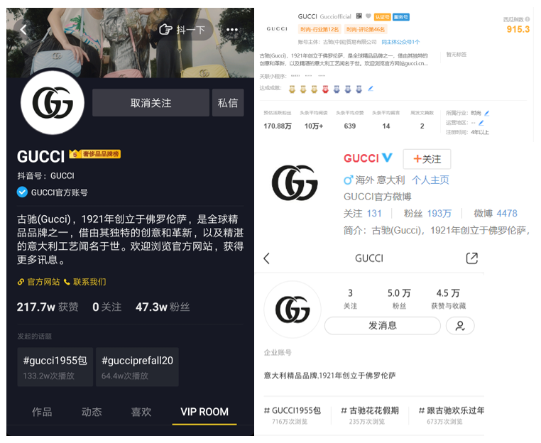 除了小红书,目前Gucci在微博、微信、抖音、甚至是刚开始不久的微信视频号,全都设立了官方账号,其中微博、微信的粉丝数均已超过百万。今年4月入驻抖音,官方粉丝也已经达到47万,相关话题也达到了百万播放量。