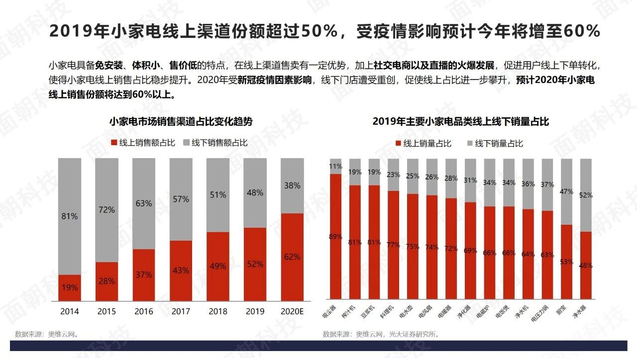 值得关注的是,2019年小家电市场规模占家电行业的50%,市场增速近六年来均保持10%以上的同比增长速度,撑起了家电市场的半壁江山。其中,区别于传统热水器、空调等依赖线下门店销售以及安装的家电类型,小家电线上渠道份额超过50%,受疫情影响预计今年线上份额将增至60%。