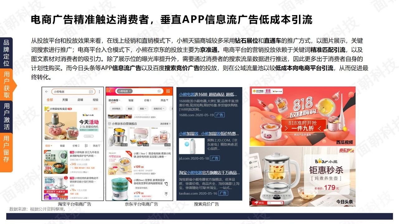 从投放平台和投放效果来看,在线上经销和直销模式下,小熊天猫商城较多采用钻石展位和直通车的推广方式,以图片展示,关键词搜索进行推广;电商平台入仓模式下,小熊在京东的投放主要为京准通。电商平台的营销投放依赖于关键词精准匹配引流,以及图文素材对消费者的吸引力。除了展示位的曝光率提升外,需要通过消费者的搜索流量数据进行推送,因此更多出于消费者自身的计划性购买。而今日头条等APP信息流广告以及百度搜索竞价广告的投放,则在公域流量池以较低成本向电商平台引流,从而促进最终转化。