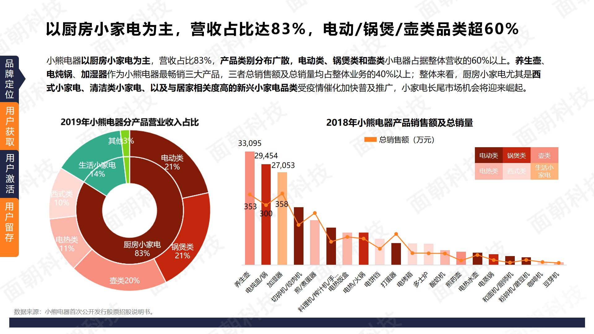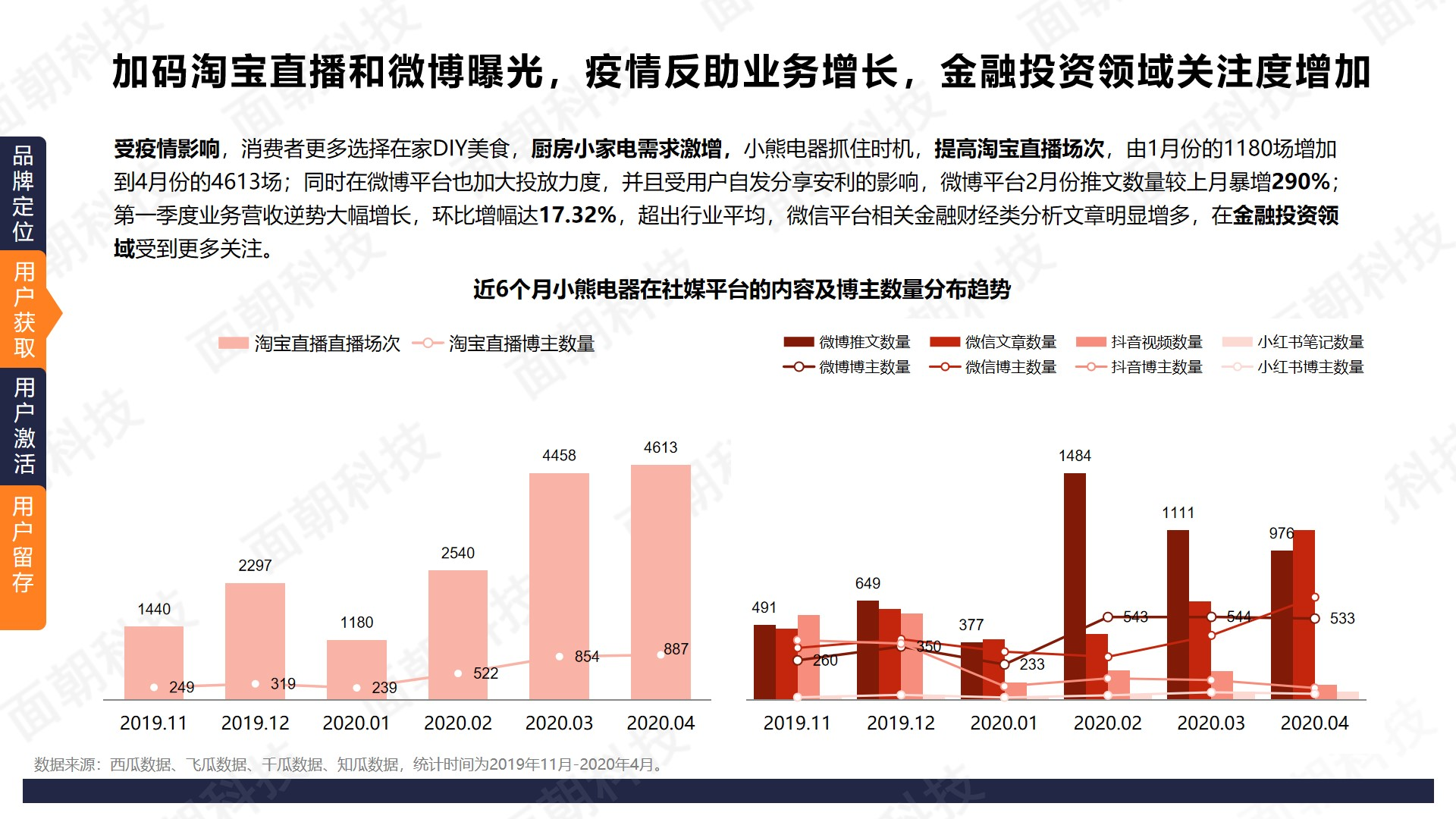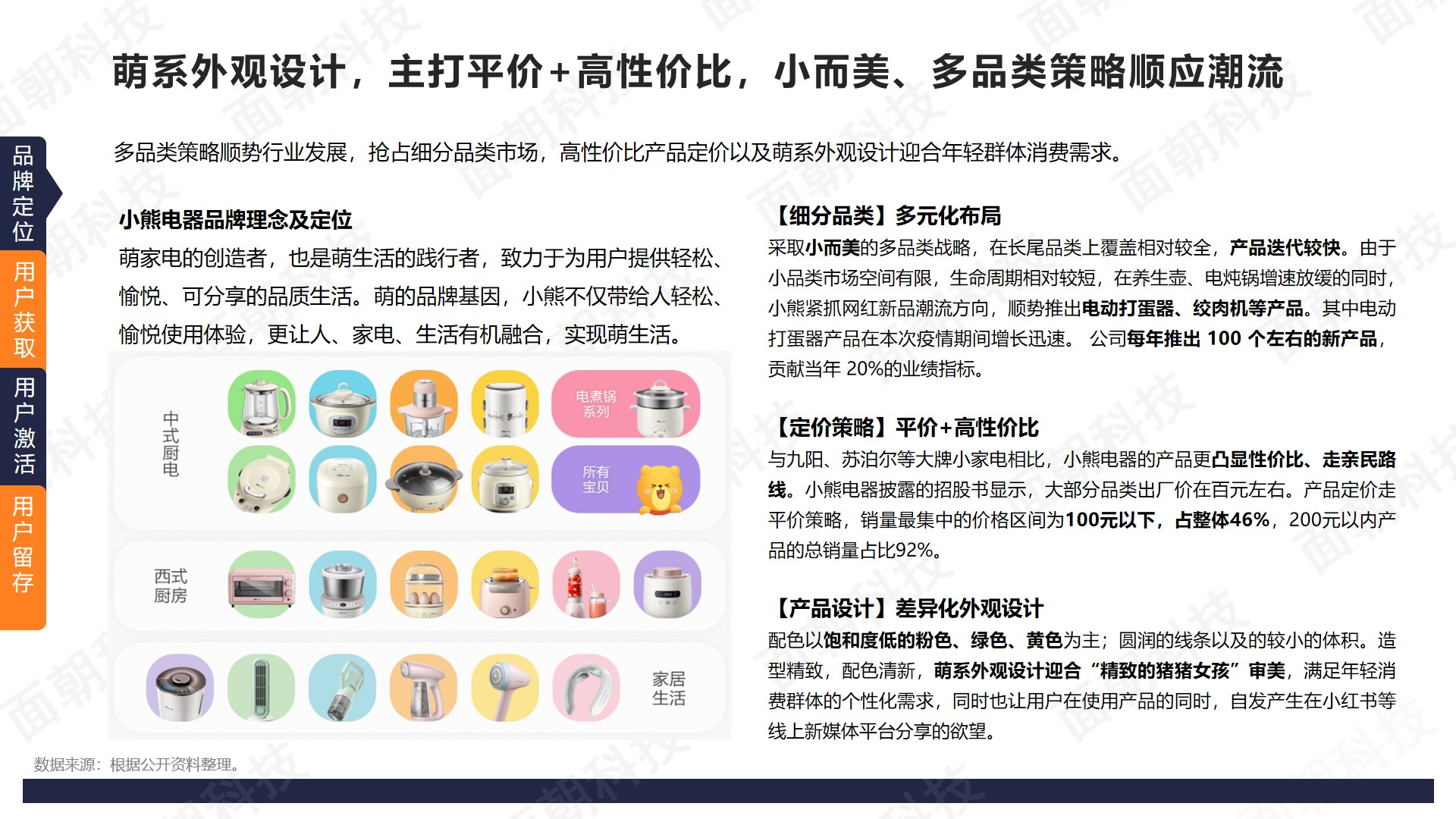董明珠声势 浩大的 直播 之旅 ,使 家 电业再一次走进 大众 视线。 根据面朝 研 究院全新 报告《 “萌家电”品牌社媒出圈打法 》 发现, 2 019年全国家电行业整体市场规模为 8032亿元, 同比增速首次出现负增长 。 值得关注的是, 2019年小家电市场规模占家电行业的50% ,市场增速近 六年来均保持10%以上的同比增长速度, 撑起了家电市场的半壁江山 。其中,区别于传统热水器、空调等依赖线下门店销售以及安装的家电类型, 小家电线上渠道份额超过50% ,受疫情影响预计今年线上份额将增至60%。 注: 小家电市场包括厨房小家电(电饭煲/电蒸炖锅等)、生活小家电(吸尘器/加湿器等)及其他小家电产品。 更多数据可在40页完整正序版报告查看,后台回复“ 家电 ”即可获取。 本文数据来自: 面朝科技旗下西瓜数据、知瓜数据、千瓜数据 统计时间:2019年11月1日-2020年4月30日 用户消费需求的升级, 创意小家电逐渐成为刚需产品,同时伴随着用户个性化需求的提升, 以料理机为代表的多功能产品创意小家电成为新的需求增长点 。 报告显示,电水壶、破壁机、搅拌机等小家电品类线上 TOP5品牌集中度相对较低, 线上渠道细分品类市场仍存在机会 ,这也使得新锐品牌纷纷以创新小家电入局,展开差异化竞争, 小米 、奥克斯、小熊 等品牌在线上闯出 了一片天地。 以表现强劲的小熊电器为例,2019年整体营收额达26.9亿元,相较上一年增长达32%(小家电行业整体为13%)。随着用户的需求迭代,及新产品研发上市,未来增 长空间都呈现良好态势。 小熊电器是如何出圈的?报告从 品牌定位、用户获取、用户激活、用户留存 四个方向深度解析了小熊电器的品牌社媒营销过程,下面选取几个关键点分析,更多内容可在40页完整正序报告中查看。 01 品牌定位 主攻线上 ,高性价比萌家电创造者 2006年,小熊电器从创意小家电切入市场,2018年,提出“ 萌家电 ”的概念,迎合 “精致的猪猪女孩” 审美,加码新媒体、直播等玩法,吸引了一大批 18-29岁的年轻群体,他们对生活品质有一定追求,追求个性化,注重性价比。 从渠道上来看, 对于新锐品牌来说, 用户在线上购买决策时,容 易受 价 格及优惠、外观设计、广告营销 等因素影响,个性化需求高,选择范围及成本相对线下购买都具有较大优势, 发展空间也就相对更大。 以小熊电器为例,面对行业巨头在线下市场份额的挤压,将重心放在了线上渠道,自2016年起, 线上渠道的营收占比就一直保持在90%以上 ,直销、经销、电商平台入仓等多种线上模式的组合,取得了不错的销售转化。 从产品上来看,小熊电器以厨房小家电为主,营收占比83%,产品类别分布广散,电动类、锅煲类 和壶类小电器占据整体营收的60%以上。 养生壶、电炖锅、加湿器 等居家相关度高的小家电也是小熊电器最畅销的三大产品, 三者总销售额及总销量均占整体业务的40%以上; 整体来看,厨房小家电尤其是西式小家电、清洁类小家电、以及与居家相关度高的 新兴小家电品类受疫情催化加快普及推广,小家电长尾市场机会 将迎来崛起。 在价格定位上, 小家电的销量与售价呈现较明显的反比关系 ,小熊电器 200元以下 的产品更受用户欢迎,销量占比达到92%,2018年总销量在100万件以上的产品平均单价都在40-100之间。 02 用户获取 深耕淘宝直播,疫情期间加大宣传 对于 将渠道 铺设重点放在淘内的 新锐 小家电品牌来说,淘宝直播是一个很好的 营销推广阵地。 小熊电器近六个月关联直播场次达到1.6万场,占整体推广内容数量的60%以上,平均每月2700+场次,贡献了达99%的平台互动量。 受疫情影响,消费者更多选择在家DIY美食,厨房小家电需求激增 ,利用这个特殊时机,小熊电器的直播场次由1月份的1180场增加到4月份的4613场, 淘宝直播Q1相关互动量也随之暴增700% ; 同时在微博平台也加大投放力度,并且受用户自发分享安利的影响,微博平台2月份推文数量 较上月暴增290%。 在大环境遇冷的情况下实现逆势增长,第一季度业 务营收环比增幅达17.32%,超出行业平均。 各平台推广账号金字塔现象较明显,大量集中在长尾账号。 微博、微信、淘宝直播平台长尾账号占比均超过70%,小红书、抖音投放量相对较少,长尾账号占比55%左右,腰部账号占比40%左右。 小红书和抖音平台主要依靠素人、KOC和资深用户大量分享“种草笔记”,淘宝直播则 中 长尾账号和素人相结合,唤醒用户的购买欲望。 从投放平台和投放效果来看, 在线上经销和直销模式下,小熊天猫商城较多采用钻石展位和直通车的推广方式, 以图片展示,关键词搜索进行推广; 电商平台入仓模式下,小熊在京东的投放主要为京准通。 电商平台的营销投放依赖于关键词精准匹配引流,以及图文素材对消费者的吸引力。 除了展示位的曝光率提升外,需要通过消费者的搜索流量数据进行推送,因此更多出于消费者自身的计划性购买。 而今日头条等APP信息流广告以及百度搜索竞价广告的投放,则在公域流量池以较低成本向电商平台引流,从而促进最终转化。 03 用户激活 深度绑定明星代言,激活粉丝经济 邀请新生代流量小生 张艺兴 作为品牌代言人之后, 发起了多场品牌发声活动, 相关话题 都达到上亿微博阅读量,在 与 《我是证人》、《醉玲珑》 等影视作品合作期间,小熊电器借势明星、电影,借助与粉丝“接地气”的互动,大范围、大幅度提高了品牌声量, 同年
