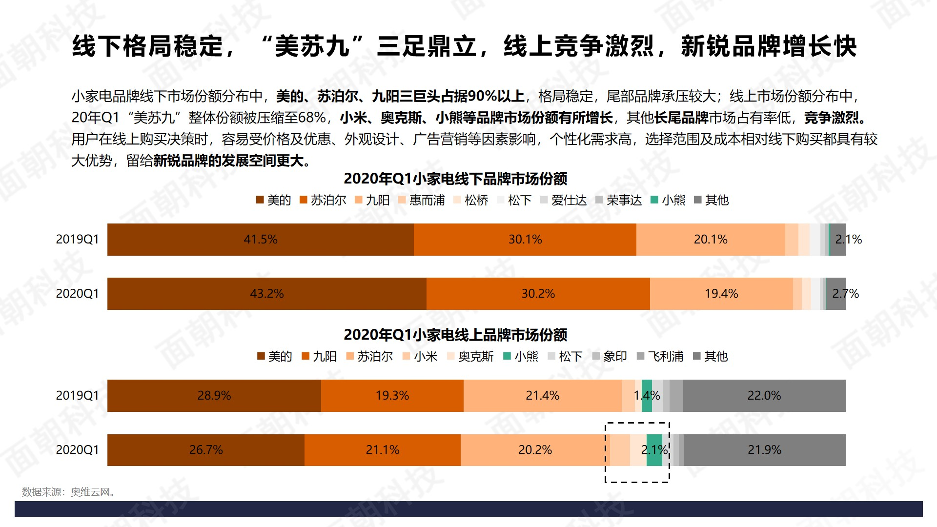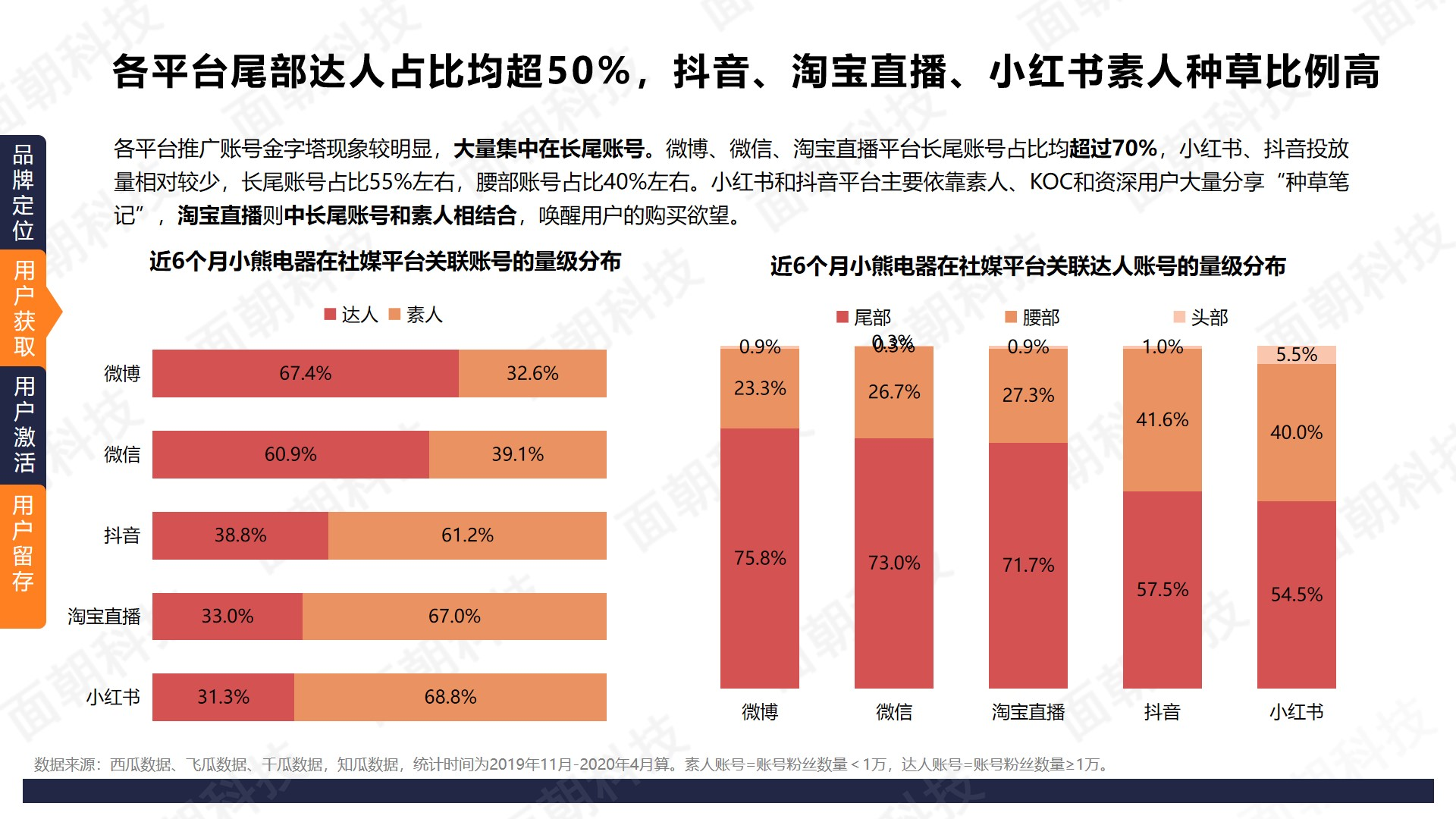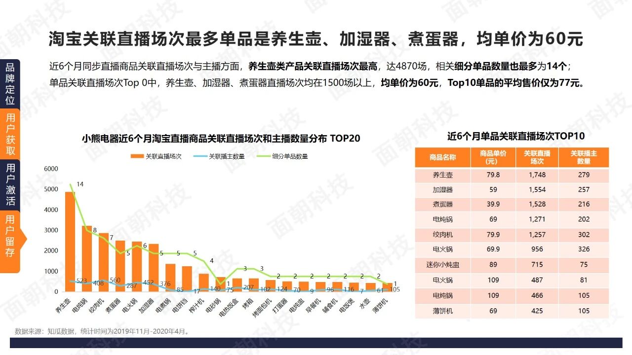 董明珠声势 浩大的 直播 之旅 ,使 家 电业再一次走进 大众 视线。 根据面朝 研 究院全新 报告《 “萌家电”品牌社媒出圈打法 》 发现, 2 019年全国家电行业整体市场规模为 8032亿元, 同比增速首次出现负增长 。 值得关注的是, 2019年小家电市场规模占家电行业的50% ,市场增速近 六年来均保持10%以上的同比增长速度, 撑起了家电市场的半壁江山 。其中,区别于传统热水器、空调等依赖线下门店销售以及安装的家电类型, 小家电线上渠道份额超过50% ,受疫情影响预计今年线上份额将增至60%。 注: 小家电市场包括厨房小家电(电饭煲/电蒸炖锅等)、生活小家电(吸尘器/加湿器等)及其他小家电产品。 更多数据可在40页完整正序版报告查看,后台回复“ 家电 ”即可获取。 本文数据来自: 面朝科技旗下西瓜数据、知瓜数据、千瓜数据 统计时间:2019年11月1日-2020年4月30日 用户消费需求的升级, 创意小家电逐渐成为刚需产品,同时伴随着用户个性化需求的提升, 以料理机为代表的多功能产品创意小家电成为新的需求增长点 。 报告显示,电水壶、破壁机、搅拌机等小家电品类线上 TOP5品牌集中度相对较低, 线上渠道细分品类市场仍存在机会 ,这也使得新锐品牌纷纷以创新小家电入局,展开差异化竞争, 小米 、奥克斯、小熊 等品牌在线上闯出 了一片天地。 以表现强劲的小熊电器为例,2019年整体营收额达26.9亿元,相较上一年增长达32%(小家电行业整体为13%)。随着用户的需求迭代,及新产品研发上市,未来增 长空间都呈现良好态势。 小熊电器是如何出圈的?报告从 品牌定位、用户获取、用户激活、用户留存 四个方向深度解析了小熊电器的品牌社媒营销过程,下面选取几个关键点分析,更多内容可在40页完整正序报告中查看。 01 品牌定位 主攻线上 ,高性价比萌家电创造者 2006年,小熊电器从创意小家电切入市场,2018年,提出“ 萌家电 ”的概念,迎合 “精致的猪猪女孩” 审美,加码新媒体、直播等玩法,吸引了一大批 18-29岁的年轻群体,他们对生活品质有一定追求,追求个性化,注重性价比。 从渠道上来看, 对于新锐品牌来说, 用户在线上购买决策时,容 易受 价 格及优惠、外观设计、广告营销 等因素影响,个性化需求高,选择范围及成本相对线下购买都具有较大优势, 发展空间也就相对更大。 以小熊电器为例,面对行业巨头在线下市场份额的挤压,将重心放在了线上渠道,自2016年起, 线上渠道的营收占比就一直保持在90%以上 ,直销、经销、电商平台入仓等多种线上模式的组合,取得了不错的销售转化。 从产品上来看,小熊电器以厨房小家电为主,营收占比83%,产品类别分布广散,电动类、锅煲类 和壶类小电器占据整体营收的60%以上。 养生壶、电炖锅、加湿器 等居家相关度高的小家电也是小熊电器最畅销的三大产品, 三者总销售额及总销量均占整体业务的40%以上; 整体来看,厨房小家电尤其是西式小家电、清洁类小家电、以及与居家相关度高的 新兴小家电品类受疫情催化加快普及推广,小家电长尾市场机会 将迎来崛起。 在价格定位上, 小家电的销量与售价呈现较明显的反比关系 ,小熊电器 200元以下 的产品更受用户欢迎,销量占比达到92%,2018年总销量在100万件以上的产品平均单价都在40-100之间。 02 用户获取 深耕淘宝直播,疫情期间加大宣传 对于 将渠道 铺设重点放在淘内的 新锐 小家电品牌来说,淘宝直播是一个很好的 营销推广阵地。 小熊电器近六个月关联直播场次达到1.6万场,占整体推广内容数量的60%以上,平均每月2700+场次,贡献了达99%的平台互动量。 受疫情影响,消费者更多选择在家DIY美食,厨房小家电需求激增 ,利用这个特殊时机,小熊电器的直播场次由1月份的1180场增加到4月份的4613场, 淘宝直播Q1相关互动量也随之暴增700% ; 同时在微博平台也加大投放力度,并且受用户自发分享安利的影响,微博平台2月份推文数量 较上月暴增290%。 在大环境遇冷的情况下实现逆势增长,第一季度业 务营收环比增幅达17.32%,超出行业平均。 各平台推广账号金字塔现象较明显,大量集中在长尾账号。 微博、微信、淘宝直播平台长尾账号占比均超过70%,小红书、抖音投放量相对较少,长尾账号占比55%左右,腰部账号占比40%左右。 小红书和抖音平台主要依靠素人、KOC和资深用户大量分享“种草笔记”,淘宝直播则 中 长尾账号和素人相结合,唤醒用户的购买欲望。 从投放平台和投放效果来看, 在线上经销和直销模式下,小熊天猫商城较多采用钻石展位和直通车的推广方式, 以图片展示,关键词搜索进行推广; 电商平台入仓模式下,小熊在京东的投放主要为京准通。 电商平台的营销投放依赖于关键词精准匹配引流,以及图文素材对消费者的吸引力。 除了展示位的曝光率提升外,需要通过消费者的搜索流量数据进行推送,因此更多出于消费者自身的计划性购买。 而今日头条等APP信息流广告以及百度搜索竞价广告的投放,则在公域流量池以较低成本向电商平台引流,从而促进最终转化。 03 用户激活 深度绑定明星代言,激活粉丝经济 邀请新生代流量小生 张艺兴 作为品牌代言人之后, 发起了多场品牌发声活动, 相关话题 都达到上亿微博阅读量,在 与 《我是证人》、《醉玲珑》 等影视作品合作期间,小熊电器借势明星、电影,借助与粉丝“接地气”的互动,大范围、大幅度提高了品牌声量, 同年