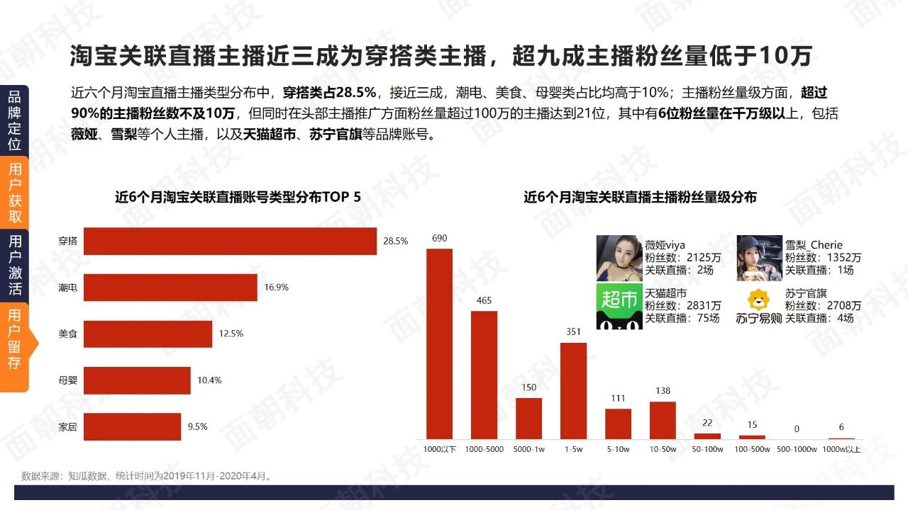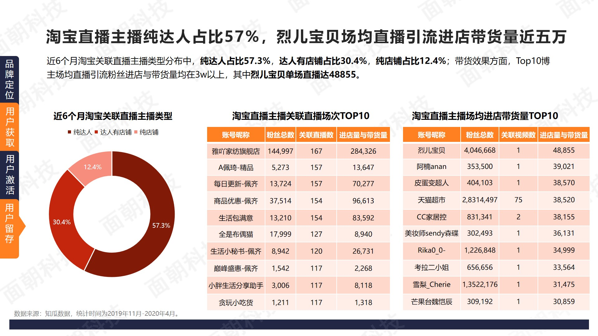 近6个月淘宝关联直播主播类型分布中,纯达人占比57.3%,达人有店铺占比30.4%,纯店铺占比12.4%;带货效果方面,Top10播主场均直播引流粉丝进店与带货量均在3w以上,其中烈儿宝贝单场直播达48855,播主带货效果良好。
