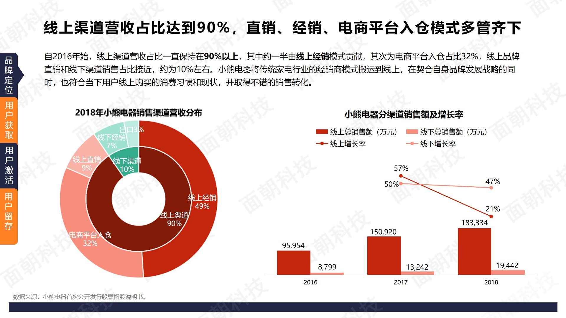 以小熊电器为例,面对行业巨头在线下市场份额的挤压,将重心放在了线上渠道,自2016年起,线上渠道的营收占比就一直保持在90%以上,直销、经销、电商平台入仓等多种线上模式的组合,取得了不错的销售转化。