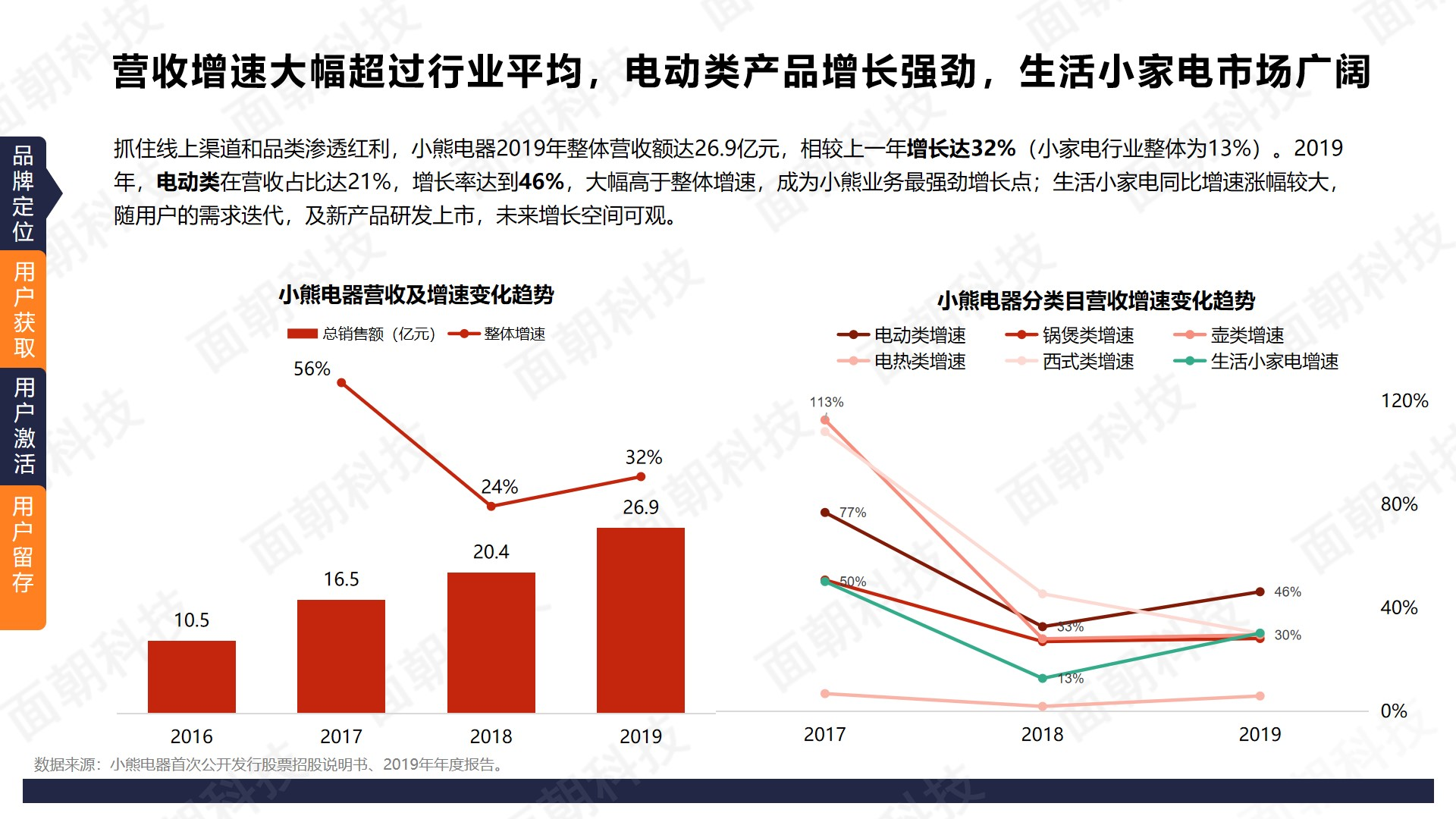 以表现强劲的小熊电器为例,2019年整体营收额达26.9亿元,相较上一年增长达32%(小家电行业整体为13%)。随着用户的需求迭代,及新产品研发上市,未来增长空间都呈现良好态势。