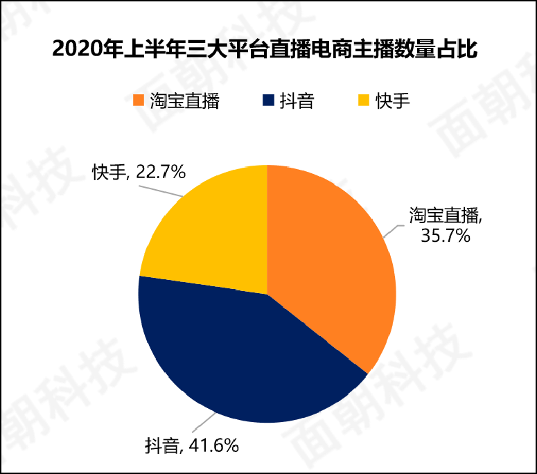 2020年上半年,淘宝直播、抖音、快手三大平台直播电商主播数量占比分布中,抖音平台直播主播数量最多,占比超41.6%,其次是淘宝直播平台,占比35.7%,快手平台占比22.7%。