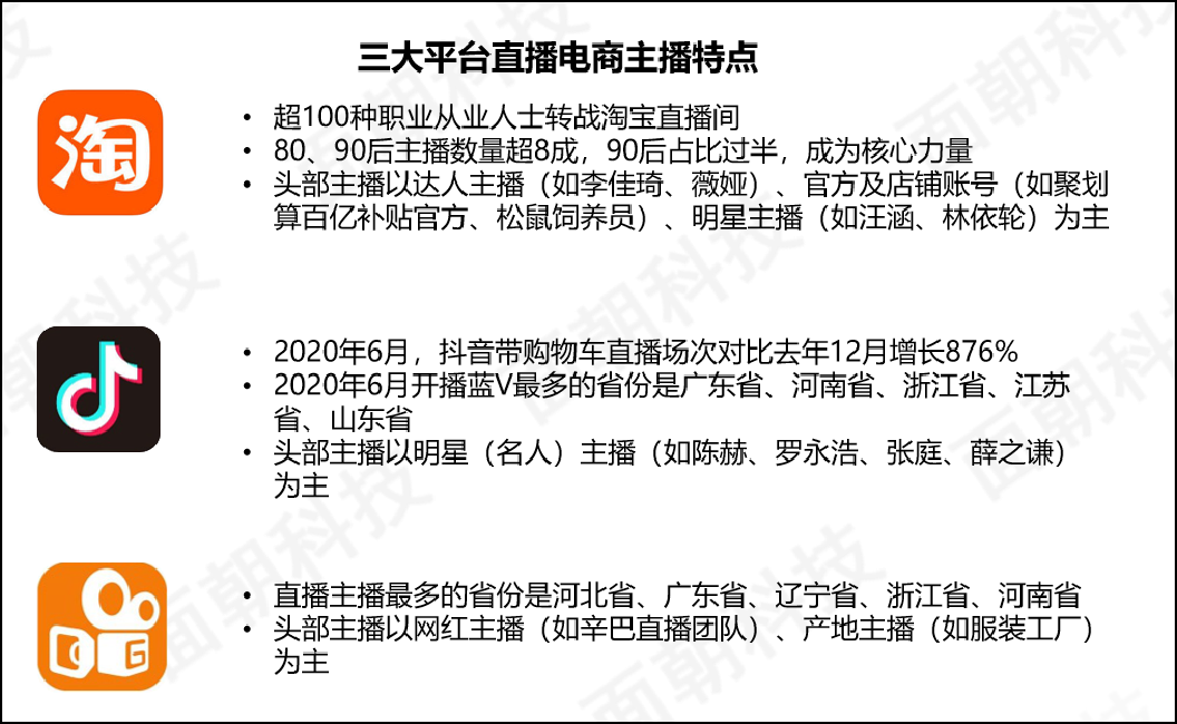 2020年直播电商入局者暴增,以往持观望态度的企业总裁、CEO们纷纷下水,把直播当成企业的”救命稻草“。 例如,林清轩创始人孙春来在2月14日情人节当天贡献自己的直播首秀,创造了 近40万元的销售额 ,在直播的带动下,林清轩3月份整体销售额 达同期120% ,店均业绩 达同期122.19% ,还登顶淘宝首个直播购物节“国货好价榜”榜首。 此外还有 携程创始人梁建章、格力电器董事长董明珠、网易CEO丁磊 等人也纷纷加入直播带货队伍,总裁带货来势汹汹。 注:从左至右依次是孙春来(林清轩)、梁建章(携程)、董明珠(格力)、丁磊(网易) 除企业老板外,受疫情影响,二月开始,包括 县长、市长在内的政府机构人员 也纷纷变身”带货官“带头刺激消费,振兴当地经济,鼓舞企业和市民信心。 据快手大数据研究院发布的《2020快手内容生态半年报》数据显示,快手平台第一期县长直播助农活动,携手 新疆、辽宁、河北、湖南、广西等11个县的县长 开展直播带货活动,近30场直播累计观看人次超 2100万 ,累计成交额超 2000万 ,带动县城经济发展。 而不久前落下帷幕的618年中狂欢大促,淘宝直播在天猫618期间吸引了 超过300位明星、600位总裁入局 , 还有各大卫视、众多县长、法官等新的角色加入直播带货。可谓人人皆可直播带货的时代到来。 这么多类型的主播该怎么选?他们之间有什么差异或优势?怎么评价? 面朝研究院将从 主播职能、直播带货优势、流量来源、货品来源、主播属性、主播五维评价模型 、未来发展趋势 等7个角度,对不同类型直播电商主播进行分析。 01 直播电商主播数量占比,抖音第一、淘宝直播第二,快手第三 2020年上半年,淘宝直播、抖音、快手三大平台直播电商主播数量占比分布中, 抖音平台 直播主播数量最多, 占比超41.6% ,其次是 淘宝直播平台 ,占比 35.7% , 快手平台占比22.7% 。 2020年,抖音加快直播电商的布局, 5月新增主播数量超170万 , 环比4月增长551%, 通过语音直播、企业直播等扶持计划,提高用户直播积极性,培养用户在抖音观看直播的习惯,为直播电商的发展奠定用户习惯基础。 数据来源:飞瓜数据、知瓜数据,统计时间:2020年1月1日-6月30日。 注释:直播主播包含有带货能力和无带货能力的主播,仅包含在统计时间范围内有开播行为的主播。 三大平台 直播电商主播头部效应显著 ,但头部主播类型不同。 淘宝直播 头部主播以 达人主播、官方及店铺主播、明星主播 为主,平台主播以80、90后为主,占比超8成; 抖音头部主播 以 明星/名人 主播为主,6月份抖音带购物车直播场次比去年12月增长876%,蓝V开播最多的省份是广东省; 快手头部主播 以 网红主播、产地主播 为主,直播主播最多的省份是河北省。 资料来源:淘榜单、巨量算数、快手大数据研究院。 02 六大类型直播电商主播:主播职能、带货优势、流量/货品来源对比 专业主播、网红 /自媒体主播、明星/名人、企业家/总裁、政府机构人员、线下转型线上行业人员 六大直播电商主播在主播职能、带货优势、流量来源、货品来源等方面各自特点不同。 从主播职能、直播带货优势上看: 1)专业主播依托自身的专业性,主要担任 专业导购 角色,品牌宣传影响力较弱; 2)网红/自媒体主播人设/个性显著,能够丰富直播内容趣味性, 以导购为主 ,属于内容营销玩法;3)明星/名人依托强大的曝光度,起到为品牌背书,提高品牌知名度的作用, 以品牌宣传为主 ;4)企业家/总裁在直播时话语权大,优惠可做主,并且比较了解企业宗旨及产品卖点, 为品牌背书,提高用户信任度 ;5)政府机构人员权威性、号召力强,社会公信力强,主要 以品牌宣传+导购 为主,助力各地经济发展;6)线下转型线上行业人员,离货比较近,有价格优势, 主要以卖货为主,基本无品宣 。 从流量来源及货品来源看: 1)专业主播原始流量基本上靠 平台扶持 ,经过 长时间的积累 ,粉丝忠诚度较高,货品主要由品牌商直供为主,少数头部主播自建供应链;2)网红/自媒体主播通过优质内容 在社交媒体平台圈粉 ,拥有一批忠实粉丝,内容变现以电商为主的网红/自媒体博主,入局直播速度较快,有部分博主已有成熟供应链保证货品供应,其他主播货品以品牌商直供为主。3)明星/名人 自带饭圈粉丝 ,有一定商业价值,货品以品牌商直供为主,大多数明星/名人走进直播间是品牌代言玩法的升级;4)企业家/总裁主要是以 品牌忠实粉丝 为主,流量大小取决于品牌资产的历史积累,以及通过运营调动店铺粉丝观看直播积极性,货品以自有厂商直供、经销商供应为主;5)政府机构人员主要以县长、市长等工作人员为主进行直播卖货,用户以 该地域粉丝或者该产地产品粉丝 为主,货品主要以原产地产品为主,也有部分品牌商直供产品;6)线下转型线上行业人员,流量主要以 线下场景(如商场、门店)粉丝 为主,将粉丝运营线上化,货品主要是工厂直供为主。 资料来源:公开网络资料,由面朝研究院整理而得。 03 六大类型直播电商主播:媒体属性VS渠道属性强弱分析 直播电商主播具备两种属性, 一是媒体属性,侧重传播(广告),二是渠道属性,侧重卖货(销售)。 六大类型直播电商主播在媒体属性、渠道属性强弱不同: 1)媒体属性从强到弱 依次是明星/名人、企业家/总裁、网红/自媒体主播、专业主播、政府机构人员、线下转型线上行业人员; 2)渠道属性从强到弱 依次是专业主播、网红/自媒体主播、