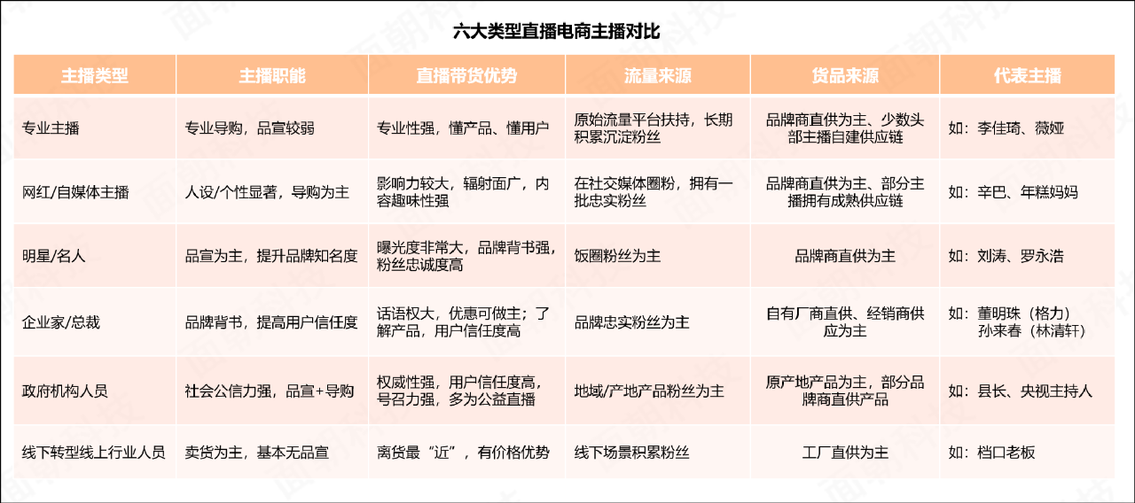 专业主播、网红/自媒体主播、明星/名人、企业家/总裁、政府机构人员、线下转型线上行业人员六大直播电商主播在主播职能、带货优势、流量来源、货品来源等方面各自特点不同。