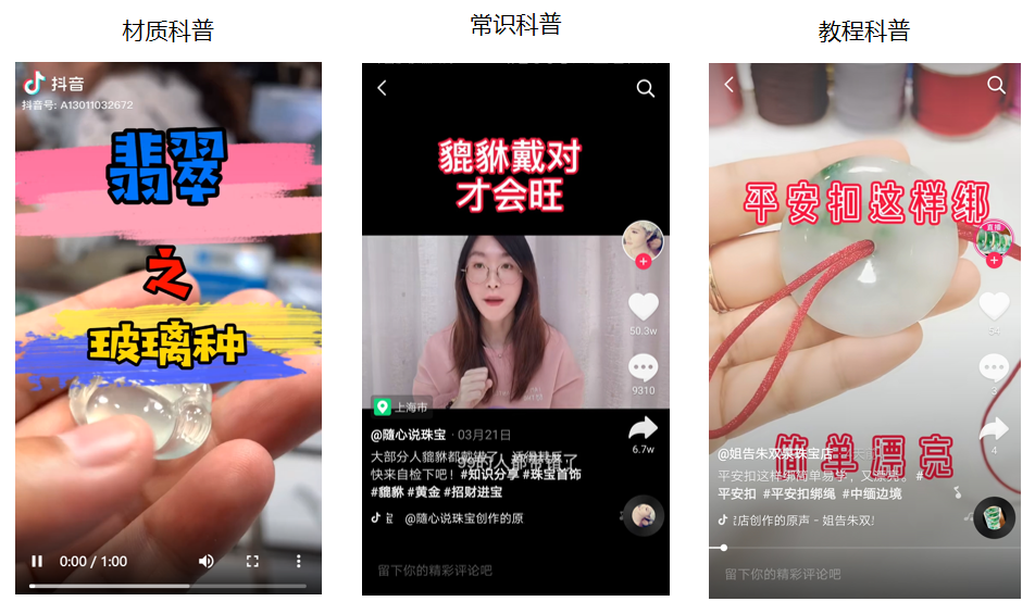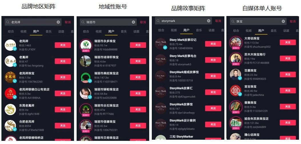“报个价吧” “8800” “8800?2800吧,宝宝们想要的打28” 这是抖音珠宝直播间的一段对话,卖的是翡翠吊坠,货主报价8800,主播根据经验判断价值,一口气砍价6000,直播间第一位给主播刷鱼或留言想要的用户就能以2800的价格买到,短短几分钟时间,讲着并不标准普通话的不知名主播就能完成客单价上千甚至过万的珠宝交易。 抖音珠宝直播间 以前珠宝行业是一门隐秘的生意,销售集中在线下,展现在消费者眼前的往往是装修辉煌的店面、精美的包装以及高昂的价格。因为层层渠道的叠加, 到达终端消费者面前的珠宝价格远远高于商品本身价值 。 再加上珠宝产业具备极强的专业性,消费者往往信任知名大牌,马太效应显著。 直播带货的风靡,让珠宝行业也发生了巨变, 抖音、快手等平台 纷纷在 瑞丽、四会等珠宝原产地建立珠宝直播 基地 。像上文所说的抖音珠宝主播与源头货主直播砍价交易的方式,也成为了如今珠宝业的一条风景线。 此前,面朝研究院发布的《 40页干货!五大角度全面解析抖音、快手直播电商生态 》发现,近6个月以来,抖音直播带货商品总销量珠宝配饰达到4.13亿元,这一小众类目有着不容小觑的实力。 在抖音,珠宝行业有着自己独有的生存法则。这里不再是名牌的天下,高额消费的用户大多都聚集在不知名品牌的直播间里。 千瓜数据显示,以珠宝为主题的抖音账号,粉丝超过百万的除了“老庙黄金”是我们熟知的品牌,其他均为不知名店铺。 飞瓜数据-百万粉丝珠宝账号 另外,观察珠宝账号的抖音小店也可以发现,店铺内多是仅有一个联系客服的链接而没有具体商品,交易都是在直播间完成。 据公开资料分析,当下,短视频流量池中,分配给直播的流量占比约为10% ,如果没有账号日常运营引流,用户很难进入直播间,前端账号内容的展示显得格外重要。 小编潜伏珠宝账号以及直播间数天,今天就来为大家揭开抖音珠宝行业的神秘面纱,那些生产爆款的账号都有哪些运营“套路”可以借鉴及参考。 一、账号设立 在抖音上,珠宝类账号设立类型主要分为: 品牌地区矩阵、地域性账号、品牌故事矩阵、自媒体单人账号 这四类。 第一类:品牌地区矩阵,适合像老凤祥这样的知名品牌。 这类品牌往往在全国各地均有相应分店, 在抖音上,品牌也有着类似的账号矩阵,由分店自主运营,但是账号之间的关联性并不强,容易出现地方账号粉丝数及活跃度高于总店的情形。 第二类:地域性账号,适合具备原产地优势的品牌。 如云南瑞丽是珠宝玉石的原产地,抖音搜索“瑞丽市”就会出现一大批以原产地命名的账号,以此来做行业专业度背书增加用户的信任感,也间接为瑞丽市打响声量,牵动整个地区产业的发展,当然了也不免出现为他人做嫁衣(引流)的情况,面对同质化账号更需要在内容上进行差异化运营。 第三类:品牌故事矩阵 , 适合小众品牌。 每个号一个不同定位,各个账号定位清晰,根据账号内容主题形成品牌账号矩阵,以此来丰富品牌故事和内容,扩大影响力。但容易出现账号之间的运营差距明显,子账号流量不高的情况。 第四类:自媒体单人账号 ,适合无独立品牌的自媒体。 如果你拥有丰富的珠宝知识但尚未有独立品牌,怎么办?那账号就可以定位成自媒体科普或其他珠宝相关内容账号。这类账号可发挥空间大,也较容易获得关注。但长期的爆款打造需要大量积累。 二、账号内容 从内容定位上来看 ,抖音上的珠宝类账号有立足珠宝大方向的多品类账号,也有针对单一品类如钻石的高集中度账号,两类账号都可以在内容基础上打造系列合集,增加每个视频之间的关联度。 多品类账号 以“大奇说珠宝”为例,粉丝数113万。 科普范围包括天珠、钻石等多品类珠宝,《这些珠宝千万不要买》这一视频得到74万的点赞 。 单一品类账号 以“百慕珠宝 ” 为例,粉丝数22万。 以钻石为主要科普对象,虽然粉丝数并不多但一个《第一次买钻戒如何防止被坑 》的视频也 获得24万的点赞。 多品类账号更易跟随热点制作内容, 话题可选范围大,制作成系列合集丰富账号内容,较易打造爆款,但需要形成专业知识体系。 在内容展现上 ,相较于服装等类目内容上多变的玩法以及频出的爆款,珠宝类账号的在日常运营玩法显得比较单一但也不缺乏特色,大致有以下几种玩法: 1、手工制作类 以手工制作为主题,辅以不同内容的文案,有精美走心的鸡汤类文案,可以有对制作工艺及材质的说明,也可以搭配故事给妇保赋予更多品牌、人文的意义。这样的内容,优点在于:流畅的制作过程赏心悦目,能批量产出内容,进行矩阵账号建设和运营,缺点则在于:内容容易被复制,有可能因为单支视频出爆款,但持续爆款的难度高。 2、科普类 科普类账号可以就珠宝鉴别、珠宝佩戴常识、使用教程等内容进行解说。这类视频优点在于:赚取用户信息差以吸引眼球,对于这块领域的小白是一堂免费课程, 只要是观众觉得对他们有帮助的内容,能 打开他们的认知的内容,都能吸引 他们的关注和转发。 且每个品类都可做成视频,较容易制作成系列主题视频。缺点在于:因为认知不同导致在评论里出现反对的声音,需要博主拥有过硬的知识储备。 3、剧情类 就如上文所说,云南瑞丽市是珠宝玉石原产地,也衍生出了短视频平台特有的珠宝交易景象,这里涌现了一大批定位中缅边境的账号,这些账号视频往往是一位