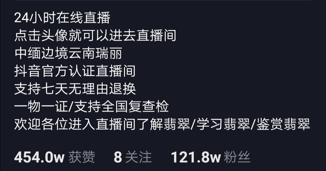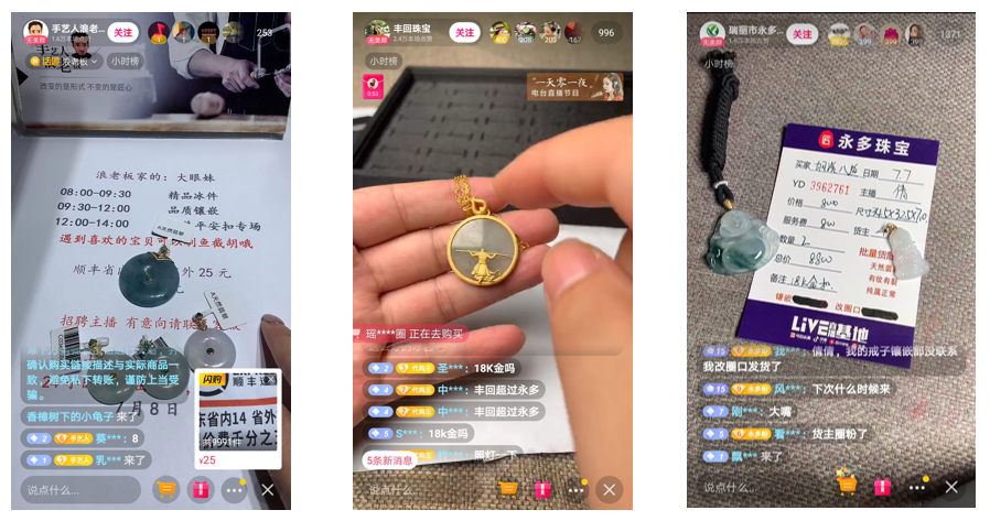 这是抖音珠宝直播间的一段对话,卖的是翡翠吊坠,货主报价8800,主播根据经验判断价值,一口气砍价6000,直播间第一位给主播刷鱼或留言想要的用户就能以2800的价格买到,短短几分钟时间,讲着并不标准普通话的不知名主播就能完成客单价上千甚至过万的珠宝交易。