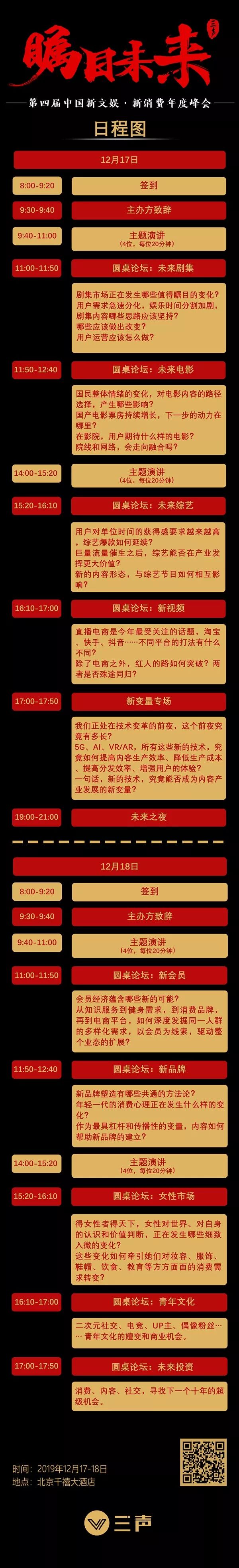 潮水上下起伏,未来值得瞩目。 在内容领域,面对外部环境和业内竞争的双重压力,如何活下去成为大部分从业者的心中之重。在文娱和消费行业,随着监管日益趋严,资本逐渐趋冷,人口红利见顶,流量成本高涨,规模化增长难以为继。 焦虑之下,行业潮水来到谷底,但我们仍怀有信心。在持续的一线观察中,我们发现向上的力量开始勃发,生长的号角已然吹响,未来的答案逐渐清晰。奋斗者依旧心怀信念,在自己的战场努力拼搏。波峰之上,值得期待。 自2016年开始,「三声」连续主办的三场年度峰会深刻影响着行业,即将主办的“第四届中国新文娱·新消费年度峰会”也已拉开帷幕。 我们将汇聚重磅嘉宾,围绕新文娱和新消费行业,聚焦内容领域,梳理商业逻辑,把脉时代趋势,携手洞见未来。 本次年度峰会将延续三声一贯注重跨界和创新的思路,同时,正如今年的主题,我们将更注重引入具有未来前瞻性的议程设置。 例如,除了剧集、综艺、电影、投资等内容和消费领域传统版块的最新变化,以及我们每年都会专门设立的「新青年专场」,今年我们还将重点关注 电商和新视频的水乳交融; 大会员的内涵扩展和全新价值; 以拼多多、快手、抖音、B站、小红书等为代表的新电商平台,对内容和消费领域的重新改造和赋能; 我们还将讨论年轻一代生活方式的多元化和趋同性,如何给各个细分领域带来新品牌的创设机会; 设计力如何帮助企业赢得新一代消费者; 5G、AI、互动、VR等技术,在新的产业环境下,如何在内容的生产效能、分发效率等各方面,产生实质性的价值…… 与以往相比,我们将对所邀嘉宾进行更精心的筛选,对分享内容进行更严格的打磨,我们还会有其它一些细节上的新设置。总之,我们希望能准备得更细致,让参与的朋友们有更丰厚的收获。 在这里,「三声」也诚挚邀请大家后台留言向我们推荐有干货的分享嘉宾,当然,自荐也同样欢迎。 环境越是寒冷,真正优秀的个人、产品和公司越容易脱颖而出。潮水开始起伏,优秀的,自然值得更好的。 年度最佳剧集、年度最佳综艺、年度电影、年度新锐公司、 年度消费公司、 年度创新案例…… 我们怀着十足的诚意,希望通过对这些逆势生长的榜样进行褒奖,表达敬意,鼓舞士气。 我们期待 12月17日-18日的两天峰会 ,能够帮助大家从眼前的压抑和低沉中跳出,看到更广阔的图景,和在当下孕育中的勃勃生机。 以下是截至12月1日已经确认出席峰会的演讲和圆桌对话嘉宾。 活动日程